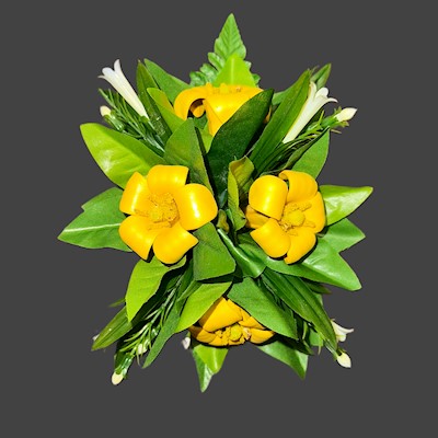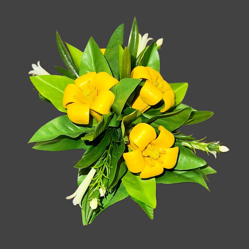 A beautiful hair clip featuring four vibrant puakenikeni blooms accented with lush greenery and delicate filler flowers. Measuring approximately 3.5 inches, this tropical clip adds a bright, island-inspired touch—perfect for hula, special events, or everyday wear. Measurements Clip size: ~4 inches Total clip size: ~6 inches