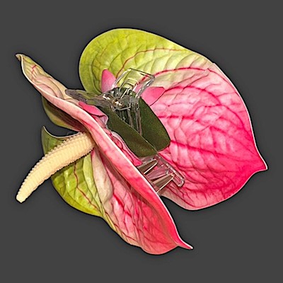 This Large Anthurium Claw Clip – Pink features a beautifully detailed anthurium bloom in soft pink hues with subtle green undertones, creating a natural, elegant island look. The anthuriums measures approximately 5.5” long and 4” wide, offering a full yet refined statement that stands out without feeling heavy. The sturdy claw clip measures approximately 3.5” long and 1” wide, designed to provide a secure, comfortable hold. Perfect for hula performances, photo sessions, ceremonies, and island-inspired styling, this clip is lightweight, durable, and made to hold its shape wear after wear. A timeless floral accessory that pairs effortlessly with hula attire, island wear, and special occasions. Measurements: - Flower approx. 5.5” L x 4” W - Clip measures 3.5” L x 1” W