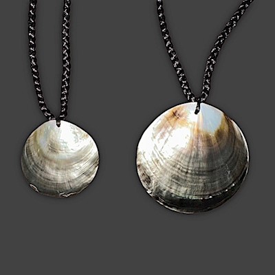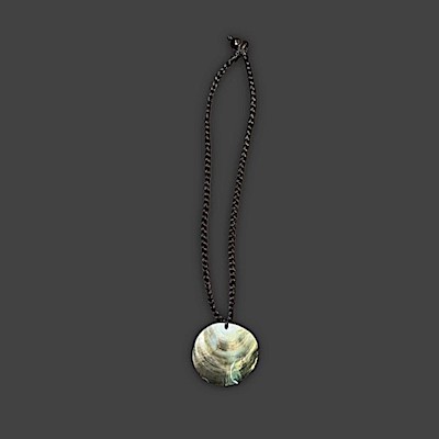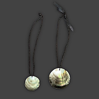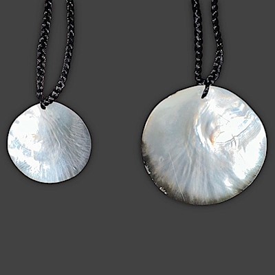 A simple mother of pearl shell on a braided cord availble in two shell sizes (~2" and ~3"). An easy and simple necklace to go with anything.