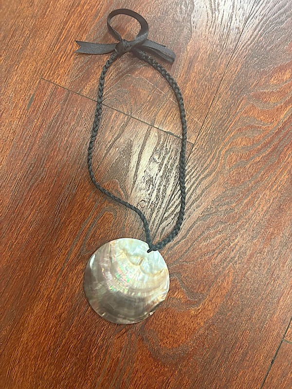 A simple 3 inch circle mother of pearl shell on a braided cord. Easy and simple necklace to go with anything. We have two suppliers and so there is slight variation in style ... black MOP has 1 hole for the black cord, white cabebe shell has 2 holes with ivory cord. Only Black is available.