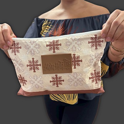 Lightweight zip pouch featuring a soft neutral tone with an ipu heke-inspired patterned design and coordinating solid bottom panel. Finished with a smooth zipper closure and branded patch detail—perfect for travel, beach days, or organizing everyday essentials.
